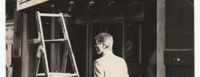 Click: My brother’s camera gives one last gasp. The hard, white sunshine lights up Bowie’s straight, planed back. Gawd, is it raining or sunny? In front, a ladder. Above, a cheap banner spells out ‘Erotic Movies’ surrounded by Hollywood lamp bulbs. A dark ceiling dotted with lights shaped like flying saucers, a nod to the alien passing by below. The glass front contains a blurry ghost of a woman.