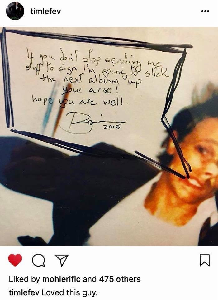 TL 2. He was such a funny guy. A world class insulter. Proud to have written insults by him on “lodger”. That and the “heroes” covers are framed and hung in my house. “Heroes” was slightly more serious. Was really glad to have a brief relationship with him.