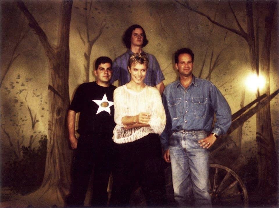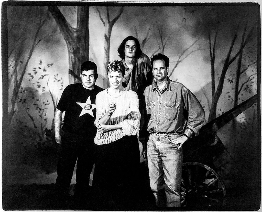Above three shots (from left): Randy Bookasta (Executive Editor of Raygun magazine), David Bowie, Mark Blackwell (Executive Editor of huH & Editorial Director, Raygun Publishing) and Marvin Scott Jarrett (Publisher & Editor-In-Chief, Raygun Publishing), Black & white group photo by Kevin Kerslake. Color group shots from Mark Blackwell’s Polaroid Captiva diary.
