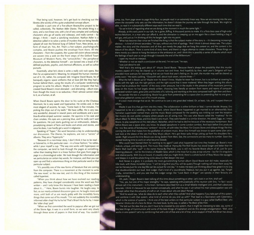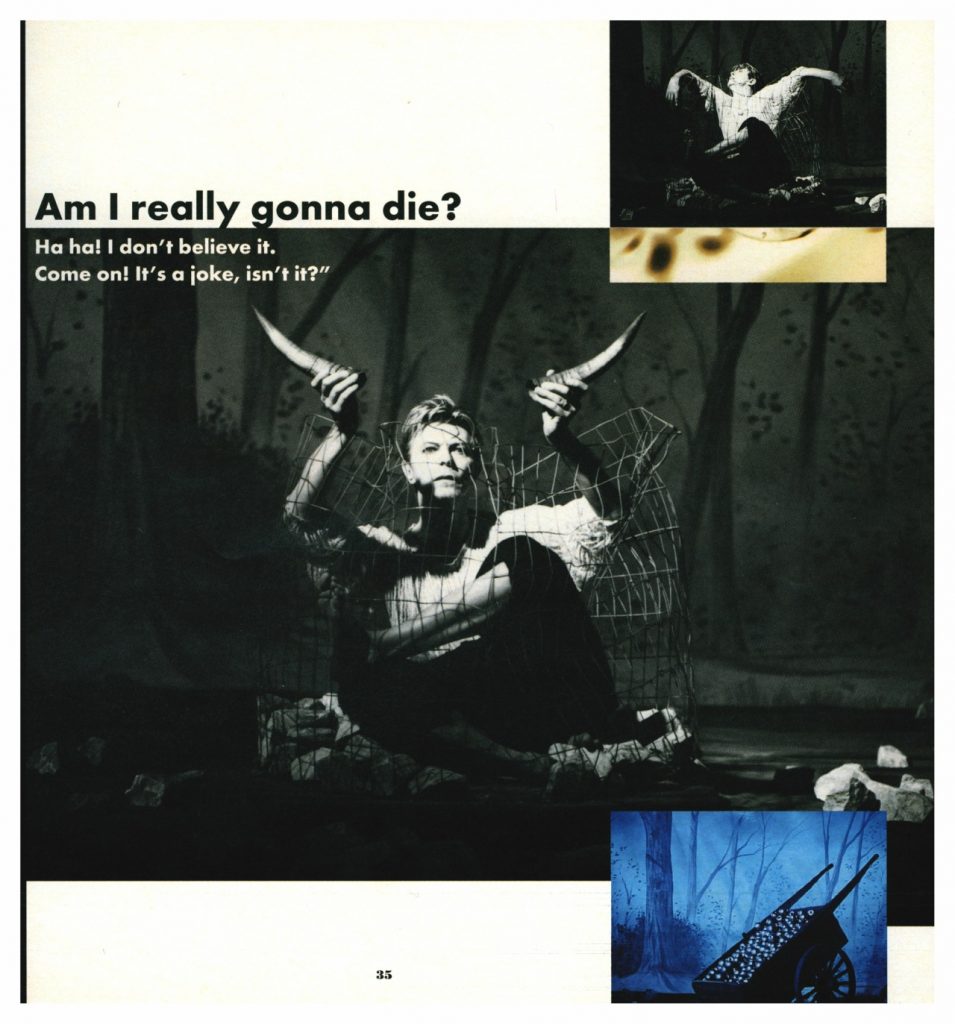 In September 1995 David Bowie was featured on the cover of huH magazine – interviewed by huH’s Managing Editor Dean Kuipers and photographed by Kevin Kerslake. huH was a subscription-only monthly music magazine produced by Raygun Publishing – designed by Jérôme Curchod with Vaughan Oliver of v23 as Creative Director and Mark Blackwell as Editorial Director. The cover (above) was designed by Vaughan Oliver.