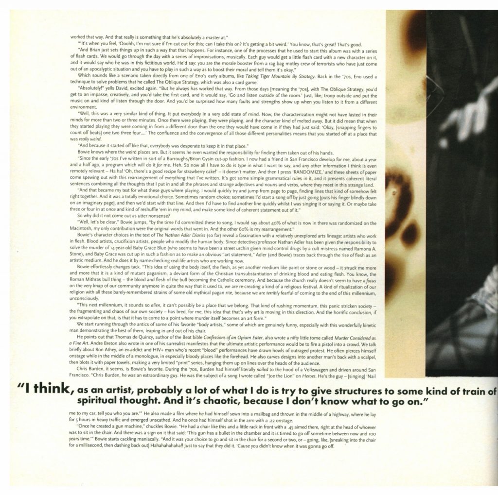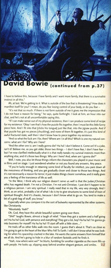 “We loved working with Bowie – and we did many cover stories and other projects with him over the years – because we always knew we’d end up with much more than just the standard thing of a singer or a musician hyping whatever their latest project happened to be and answering the same questions every other magazine would be asking in the exact same way. With Bowie it would always become some grand artistic collaboration of sorts – the photos would be unique and beautiful and the interview would be deep and thought-provoking. We’d match him up with great writers like Dean Kuipers and amazing photographers like Kevin Kerslake or Ian Davies, and magic would always happen, because he was a true artist and one of those rare souls you could honestly call a ‘visionary.’ He took these collaborations with us very seriously, never approaching them as simply something he ‘had to do to promote his new record’ – plus he had a great sense of humor that always came through.”