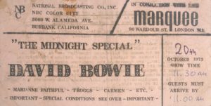 Lot 425- DAVID BOWIE MARQUEE MIDNIGHT SPECIAL TICKET. An original paper ticket for the NBC/Marquee Club ‘Midnight Special’ broadcast on 20th October 1973. Measures 20 x 10cm, in very good condition with some age wear, creasing and discolouration.