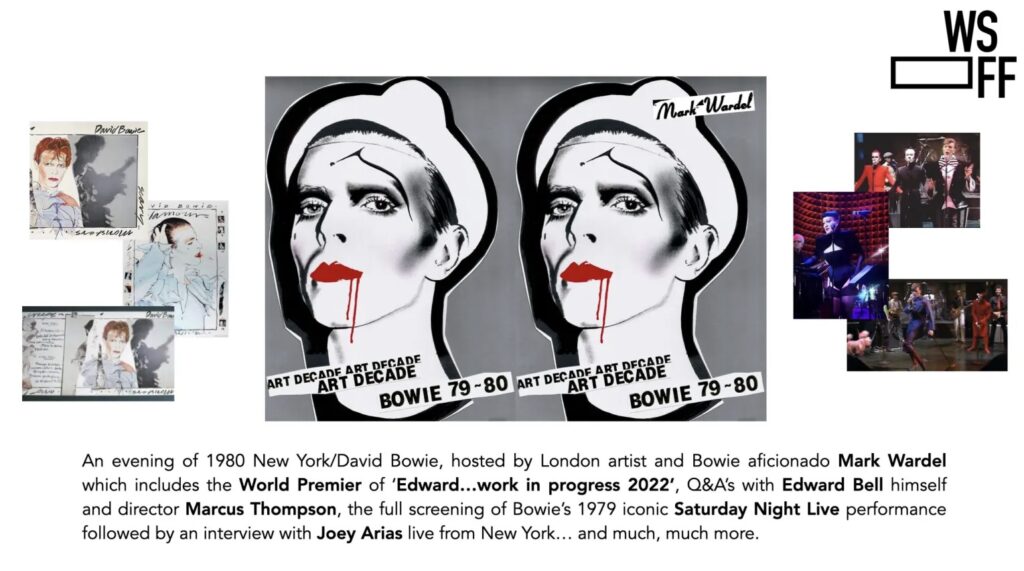 An evening of 1979 – 80 New York/David Bowie, hosted by London artist and Bowie aficionado Mark Wardel which includes the World Premier of ‘Edward…work in progress 2022’, Q&A’s with Edward Bell himself and director Marcus Thompson, the full screening of Bowie’s 1979 iconic Saturday Night Live performance followed by an interview with Joey Arias live from New York… and much, much more.