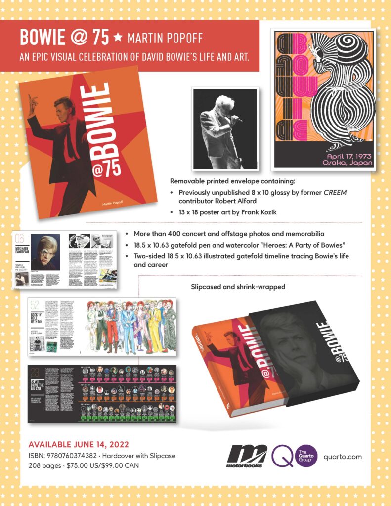 Fascination in David Bowie has only grown since his death in January 2016. In Bowie at 75, Martin Popoff examines the rock icon through the lens of 75 career accomplishments. All 27 studio albums are featured, as are a curated selection of earworm singles. But Popoff delves deeper to reveal the events that defined Bowie’s career: appearances with artists like Iggy Pop, Lou Reed, Tina Turner, and Queen; key performances such as Live Aid; collaborations with incredible guitarists Mick Ronson, Adrian Belew, Robert Fripp, Stevie Ray Vaughan, and Nile Rodgers; film and television roles; and more. From his 1967 debut LP and ending with 2016’s Blackstar, Bowie remained one of the most influential musicians and performers while constantly redefining himself.