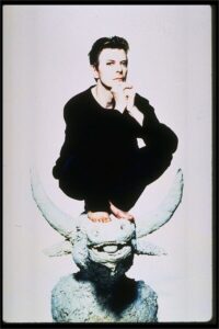 The idea of taking photos of Bowie resting on top of the stone bull’s head was completely spontaneous. The owner of the studio owned collectible sculptures, furniture and motorcycles.