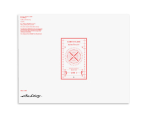 Bowie estate certificate: One 20×16 inch (508×406 mm) certificate signed by the photographer; featuring the individual book number and official David Bowie Estate stamp designed by Jonathan Barnbrook and authenticated by Tagsmart advanced secure encryption, and a comprehensive list of the contents of the book package.