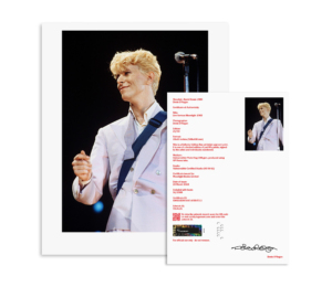 Three signed limited edition prints: Three 20×16 inch (508×406 mm) fine art photographic prints and matching certificates on Hahnemühle 308 gsm Photo Rag paper signed and hand numbered by Denis O’Regan; each in a limited edition of 50 prints, identified by Tagsmart advanced secure encryption. Delivered in a folder referencing David’s Serious Moonlight stage attire.