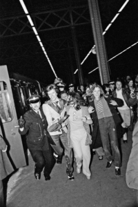 Above, Bowie greeted by crowds of fans at Charing Cross Station, London. 5th May 1973.