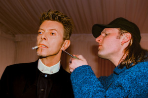 Above, David having his ear pierced backstage (ready for the Vivienne Westwood skeleton earrings) at the 1996 Brit Awards at Earl’s Court where he picked up the ‘Outstanding Contribution’ Award, which was presented to him by the then Prime Minister, Tony Blair.